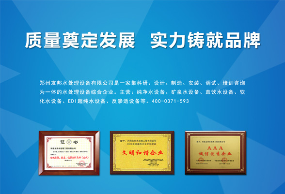 鄭州友邦水處理設(shè)備有限公司始創(chuàng)于2003年。自成立以來,友邦始終堅持以“客戶利益為保障”的原則,打造友邦口碑,備受客戶的認(rèn)可和信賴。鄭州友邦是一家專業(yè)從事水處理技術(shù)開發(fā),設(shè)備制造生產(chǎn)及銷售的企業(yè)公司。嚴(yán)格的生產(chǎn)管理系統(tǒng)環(huán)環(huán)相扣,層層把關(guān)。從原材料選購到現(xiàn)場調(diào)試安裝,鄭州友邦重視每個細節(jié)。公司以堅持技術(shù)創(chuàng)新、質(zhì)量創(chuàng)優(yōu)、服務(wù)創(chuàng)佳的原則,以優(yōu)質(zhì)的產(chǎn)品和專業(yè)的服務(wù)實現(xiàn)我們的承諾:把您擁有的水變成您需要的水!